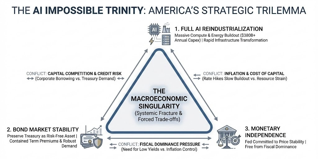 The United States has entered what can only be described as a macroeconomic singularity—a collision point where the capital, energy, and institutional requirements of the AI infrastructure buildout have smashed into the finite capacity of the physical and financial worlds. At the center of this collision sits what I term AI’s Impossible Trinity: three strategic objectives that America is attempting to achieve simultaneously, despite their fundamental mutual exclusion.